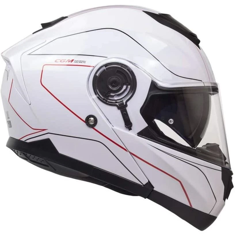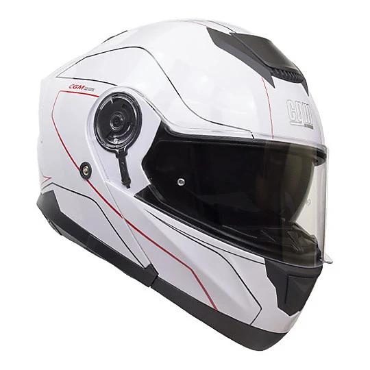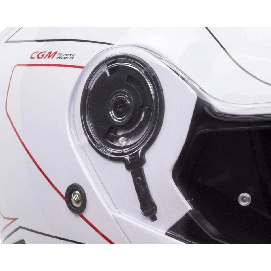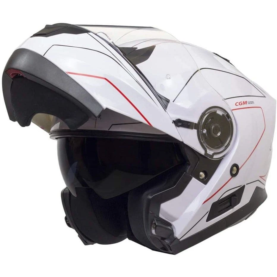 Modularer Helm mit moderner Design-Motorhaube mit Heckspoiler mit Luftabsaugung, großem Frontlufteinlass und Visier mit erweitertem Sichtfeld. Produkt mit Prädisposition für die PINLOCK-Linse, Metall-Kinnbügel-Verriegelungssystem und Freigabeknopf an der Innenseite des Kinnschutzes. In der 506G-Version werden die modernen und aerodynamischen Linien des Helms durch sportliche Grafiken in drei verschiedenen Farben unterstrichen.