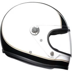 - Das Visier hat ein besseres seitliches Sichtfeld als die vorherigen und kann (mit dem Knopf an der Seite) verriegelt werden, um ein versehentliches Öffnen bei hoher Geschwindigkeit zu verhindern