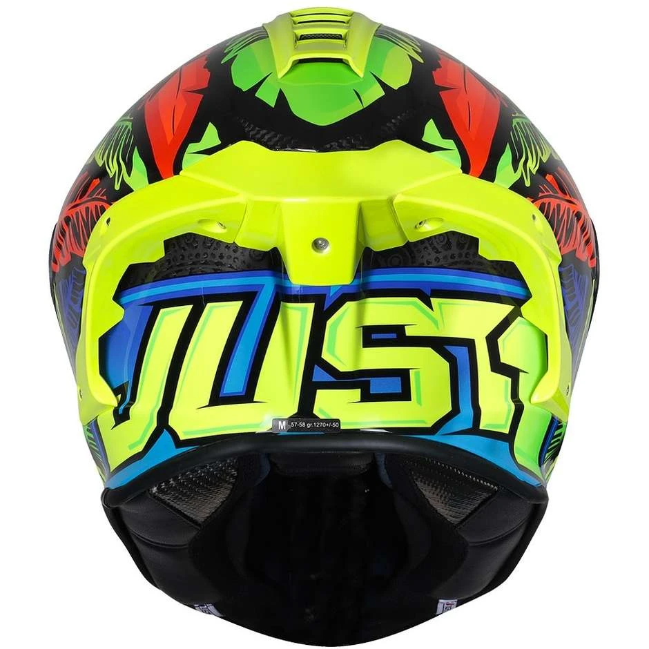Belüftung ist unerlässlich. Mit mehreren und wichtigen Lufteinlässen am Kinnschutz und an der Vorderseite des Helms wurde JUST1 J-GP R entwickelt, um die Luftzirkulation um den Kopf des Fahrers zu maximieren. Getestetes integriertes Belüftungssystem, das eine korrekte Wärmeableitung aus dem Inneren des Helms ermöglicht, für eine stets kühle Fahrt auch bei heißem Wetter.Im Windkanal-Testlabor wurden verschiedene aerodynamische Tests durchgeführt, um das höchste Leistungsniveau zu erreichen. Um die Aerodynamik des Helms bei Wettkämpfen zu verbessern, wurde ein Spoiler entwickelt, der sich perfekt an den Höcker am Anzug des Fahrers anpasst.